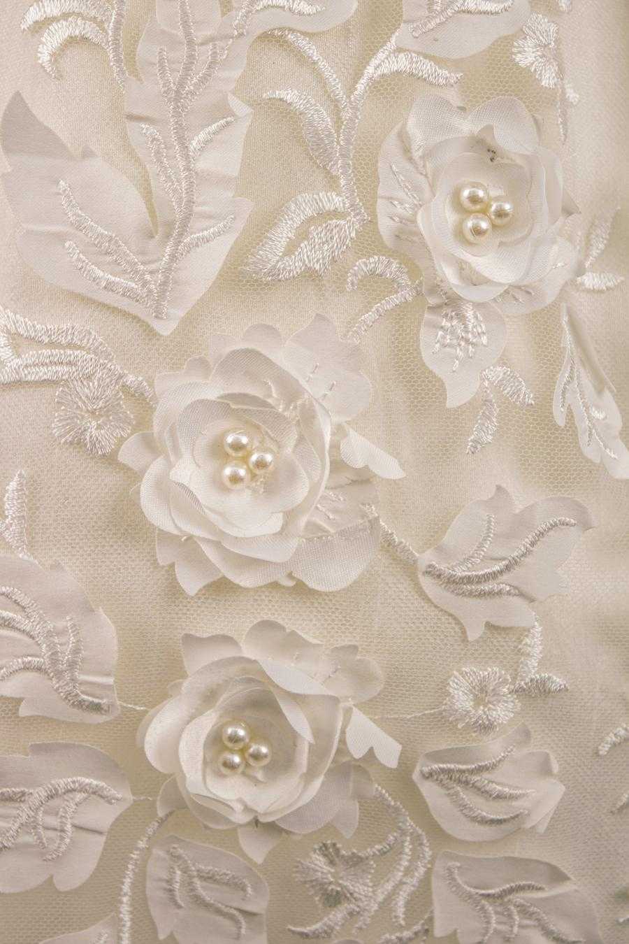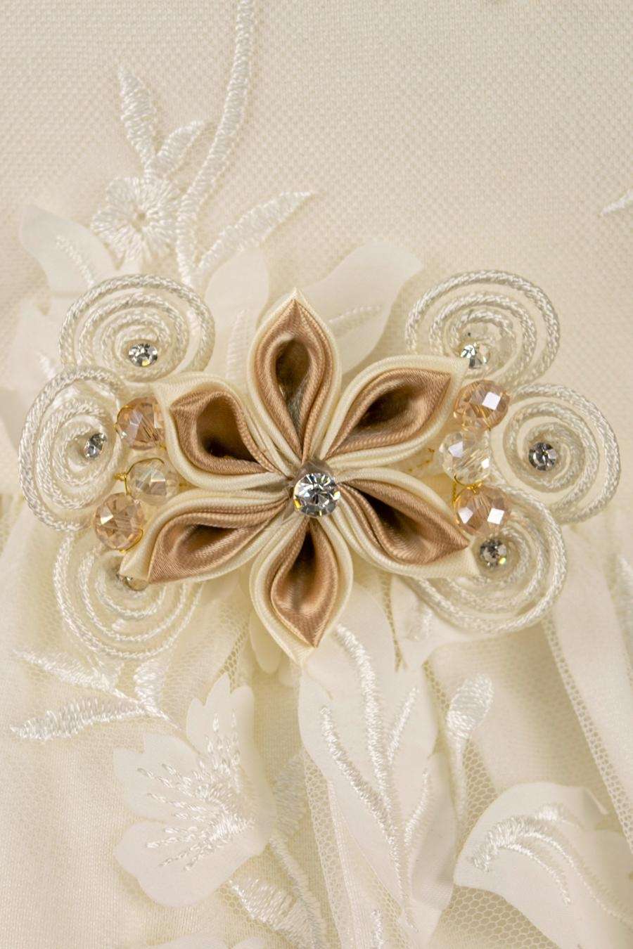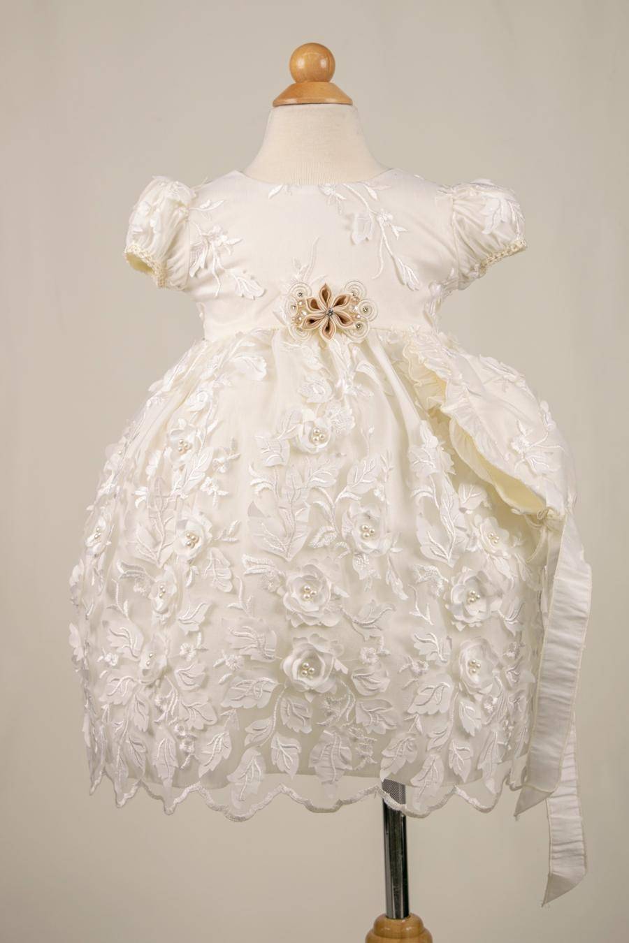 Girl’s short Ivory baptism gown with a 3d light fabric. Comes with a removable flower broche in the front. With a button closure back.