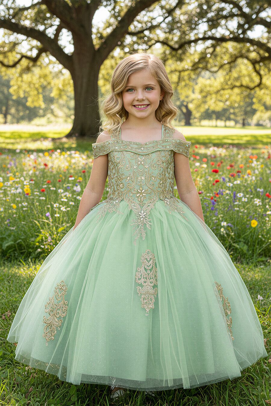 This stunning sage green ball gown dress is perfect for special occasions. It features an off-the-shoulder neckline with delicate straps, beautifully adorned with intricate gold embroidery and sparkling embellishments on the bodice.