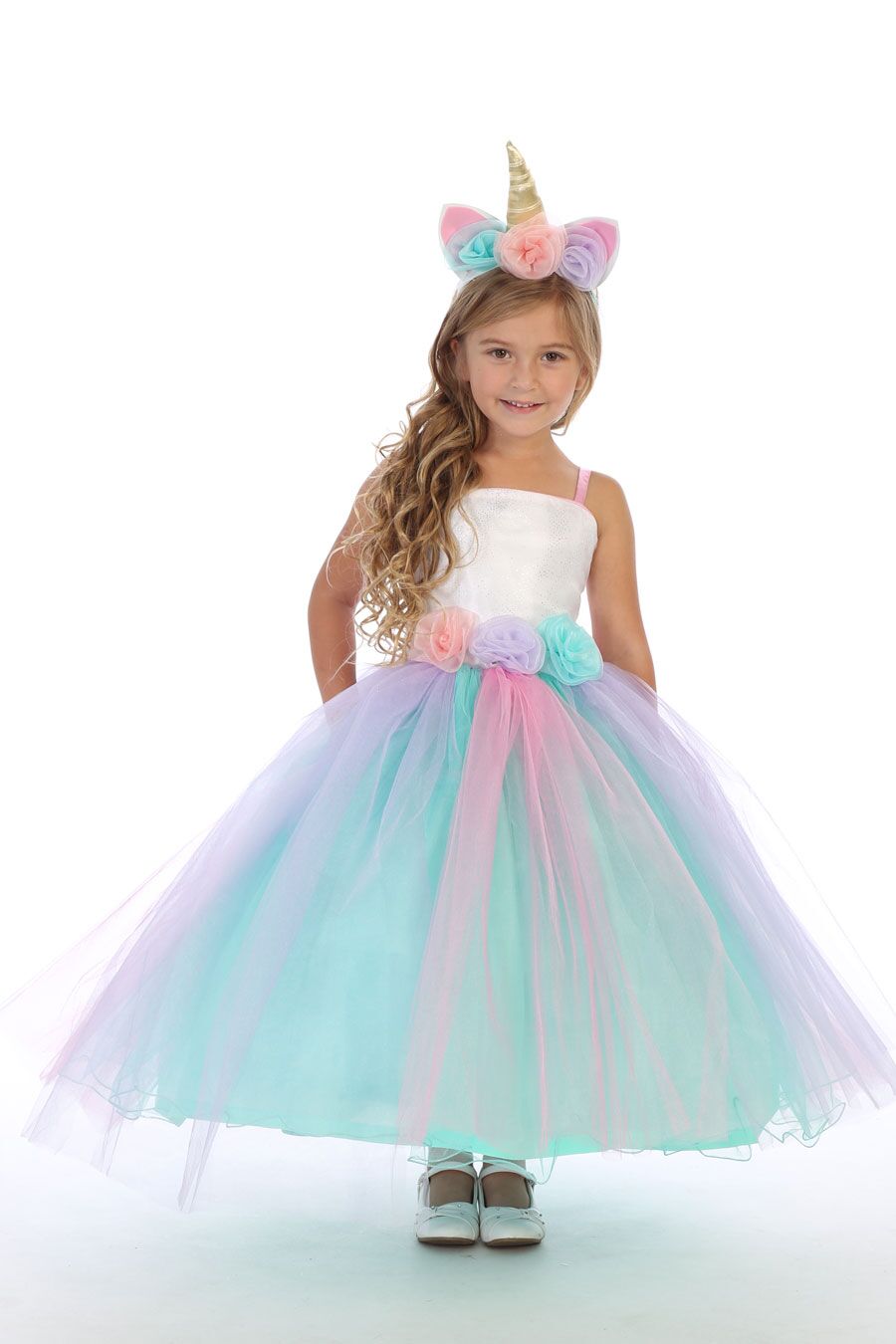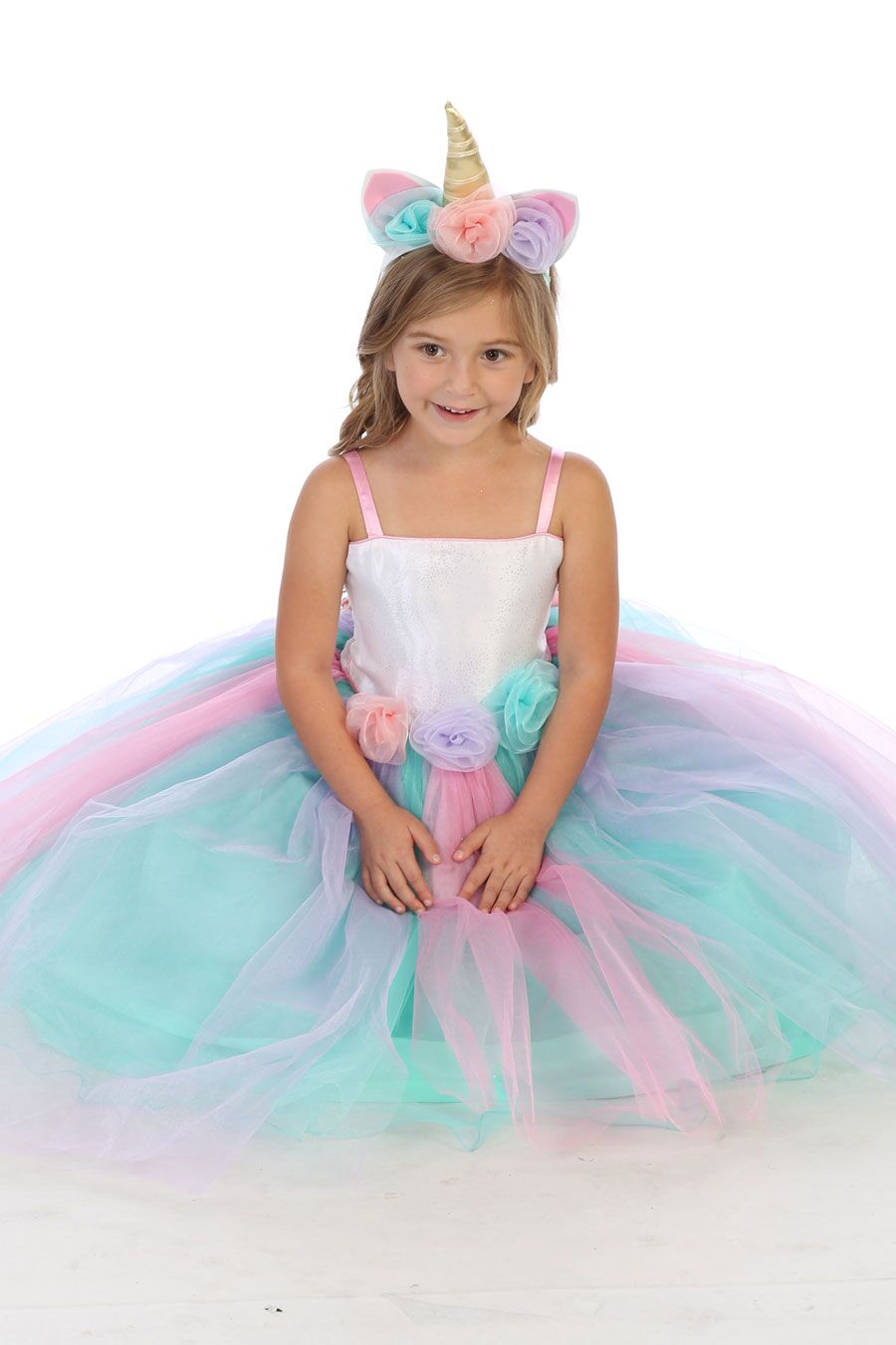 A magical rainbow dress made with tulle, satin, and organza. This magical dress is perfect for a little girls birthday party. Dress has an integrated heavy tulle petticoat integrated for added volume and can accommodate a Crinoline underneath.