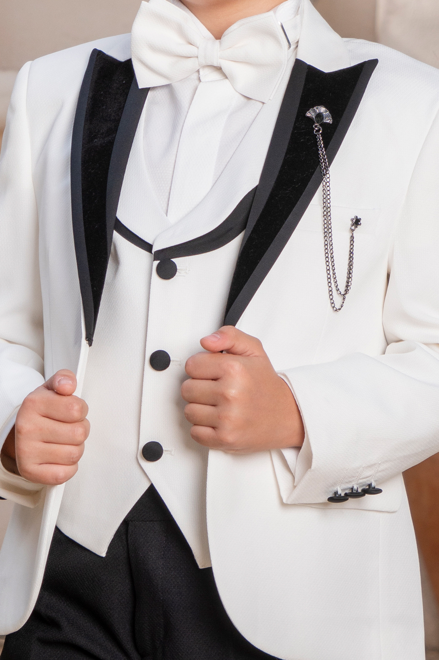 Boy’s designer tuxedo in ivory with black. Made with high fashion in mind and sought after by those who value style and quality above all else. This style is limited in quantity so get it for your boutique before it sells out.