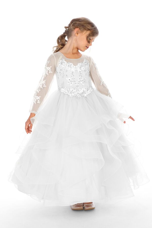 Long sleeve communion dress with embroidered sheer sleeves and bodice, embellished with rhinestones and sequins. Perfect for communion.