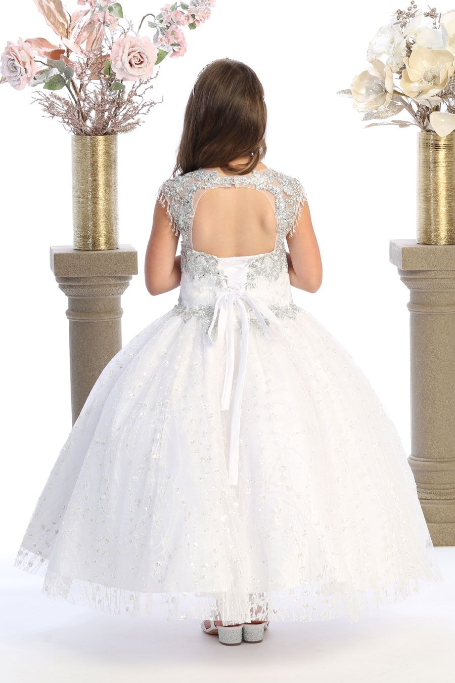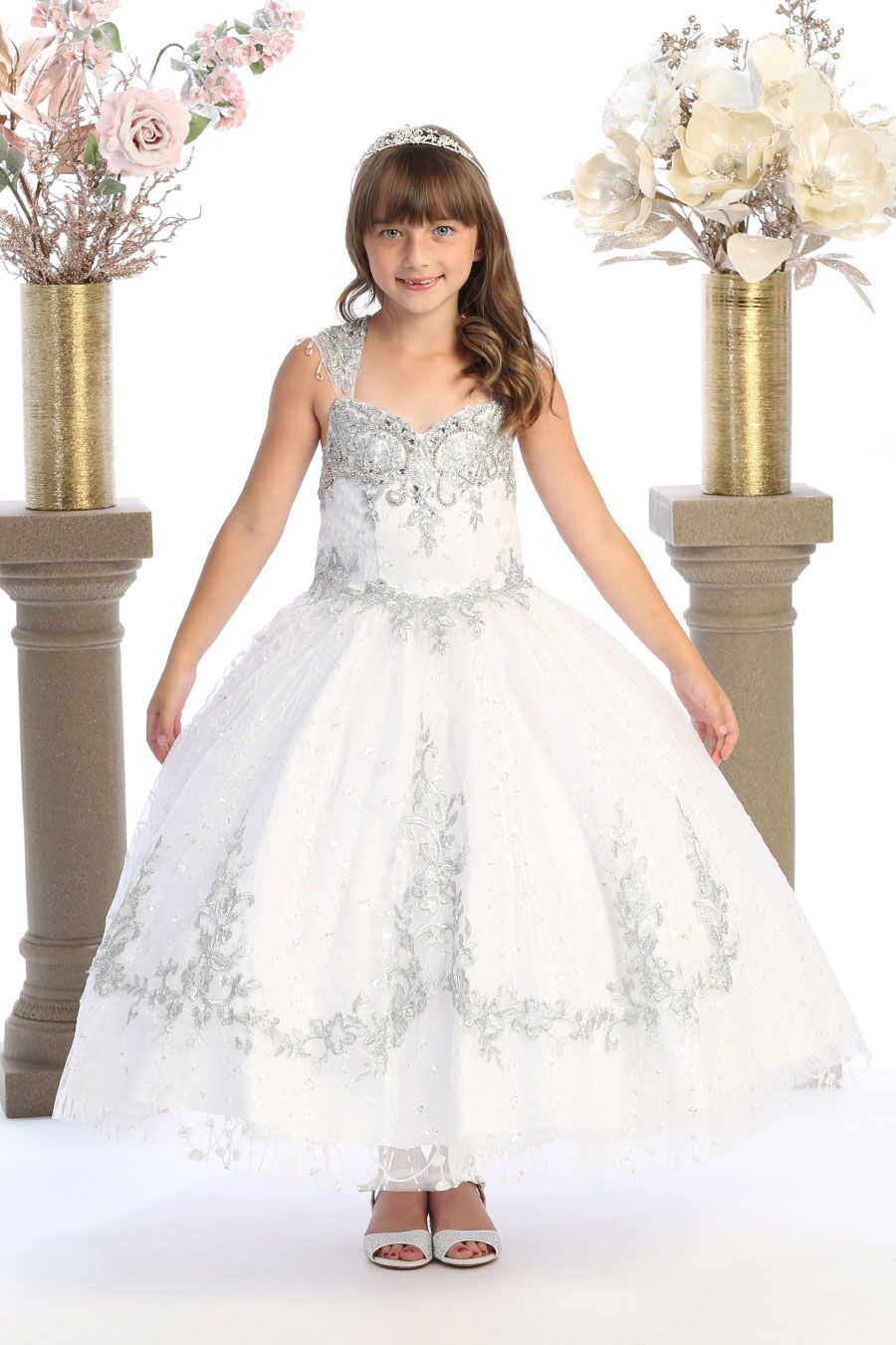 One of our most popular styles now in white with silver. Embellished with rhinestones and beads for an added estra touch of elegance. Perfect for Communions, Flower Girls, Pageants, and any special event that requieres a more dressy attire.
