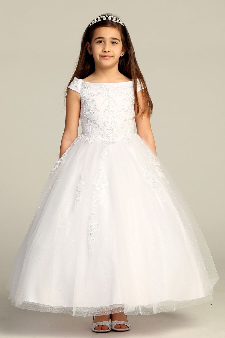 This is one of our most popular designs, the dress is very elegant and the embellished appliques add an elegant touch tot he dress. The boat neckline makes this dress perfect for Spring and summer events. The dress has a centered back zipper closure and topped off with a corset over it to adjust the dress as the child needs it.