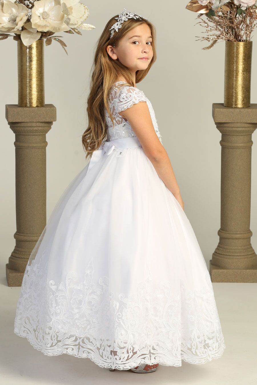 Beautiful and elegant white dress perfect for communion ceremonies. The dress is embellished with large clear rhinestones all around the bodice