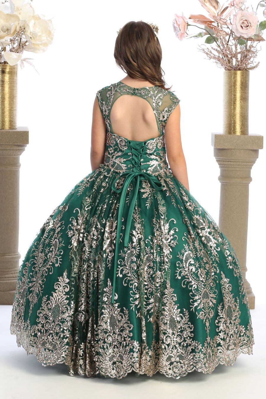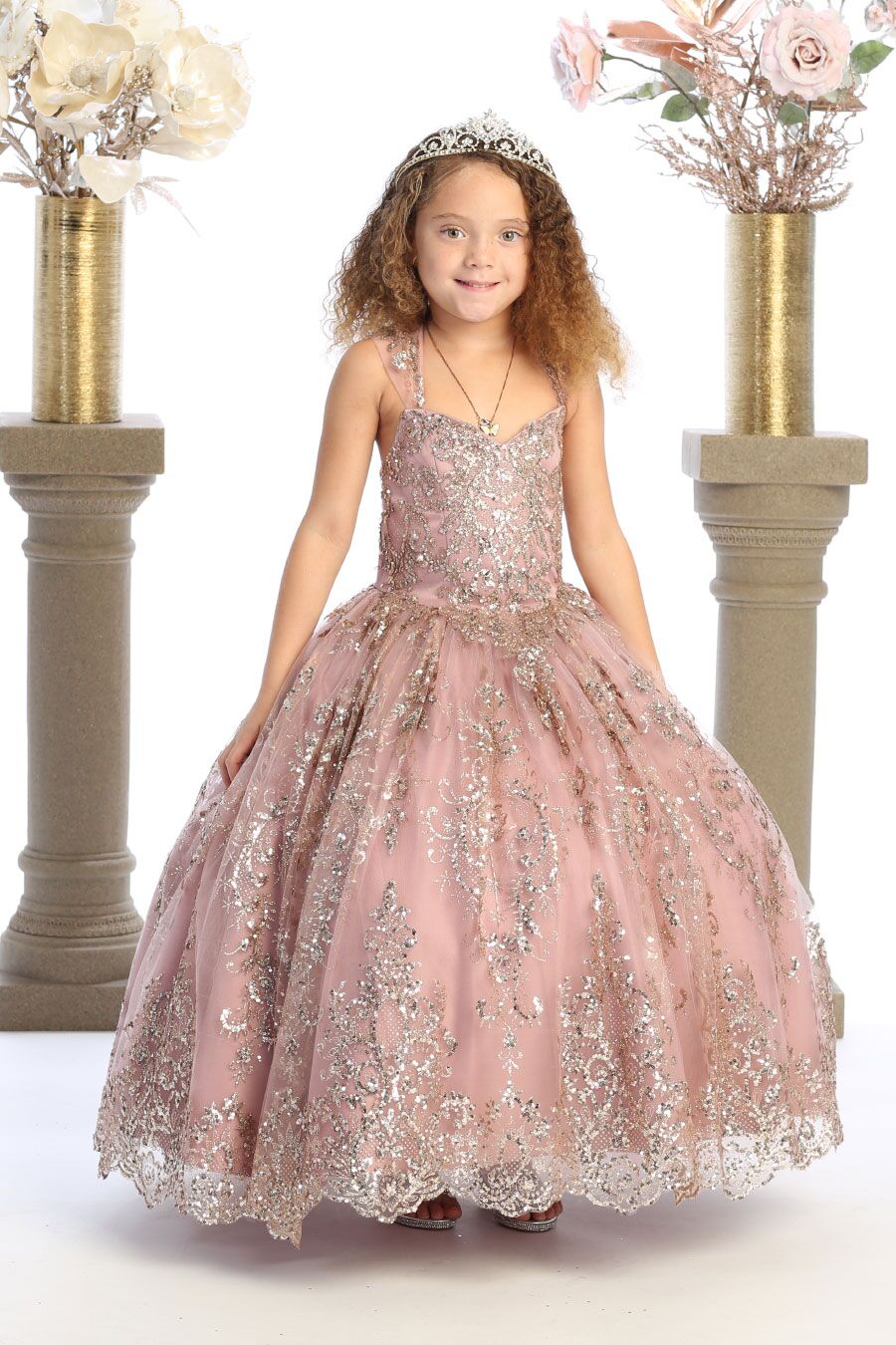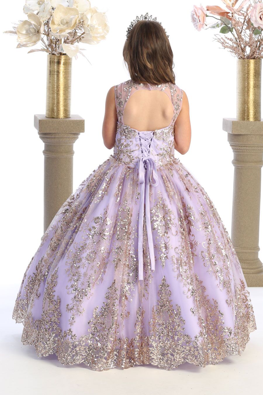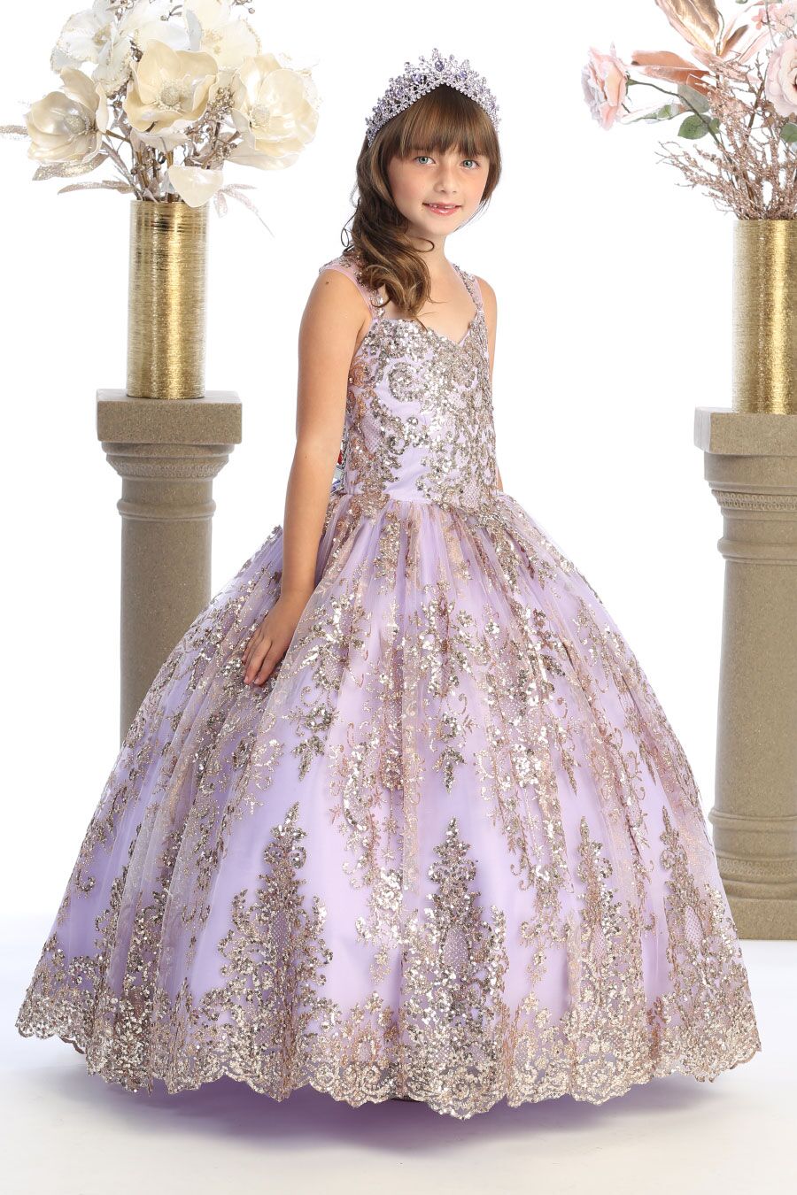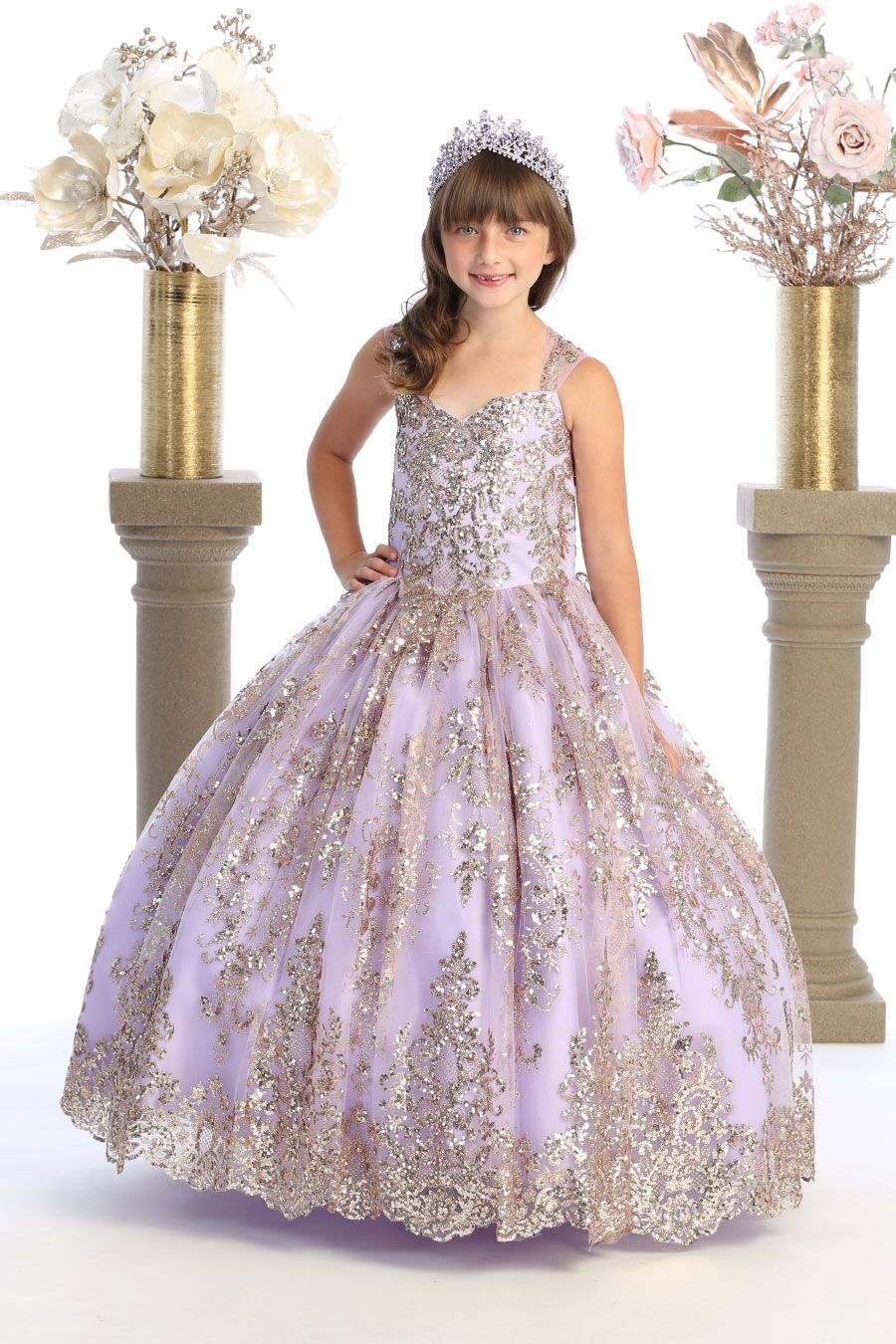 Sparkling and beautiful ballgown for girls. Available in 3 colors: Lavender, Rose, and Emerald Green. The sequins on all the dresses is gold colors. Centered back zipper closure and a corset over it will ensure the dress will fit properly