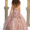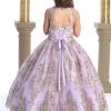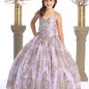 Sparkling and beautiful ballgown for girls. Available in 3 colors: Lavender, Rose, and Emerald Green. The sequins on all the dresses is gold colors. Centered back zipper closure and a corset over it will ensure the dress will fit properly