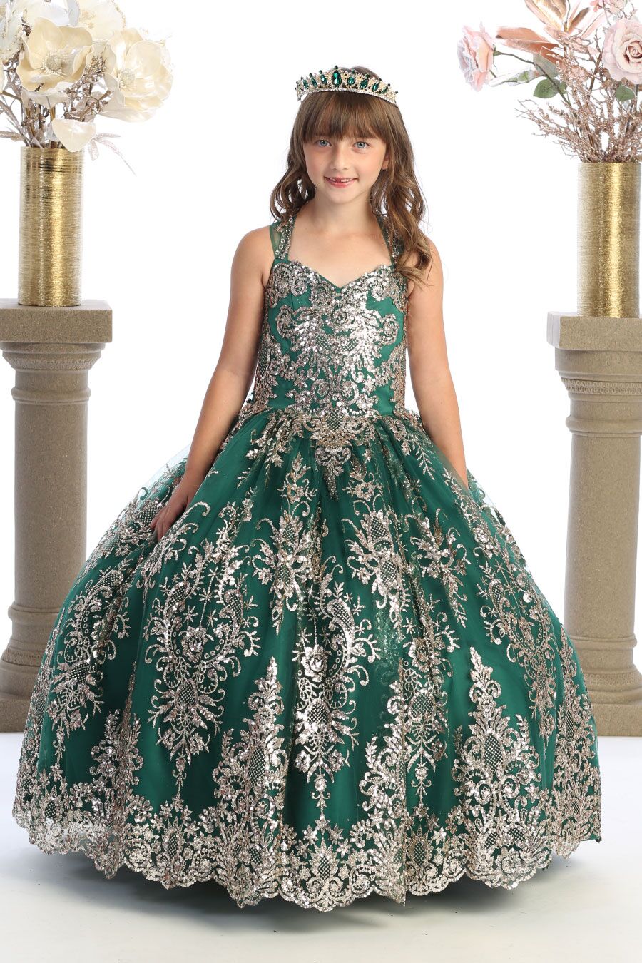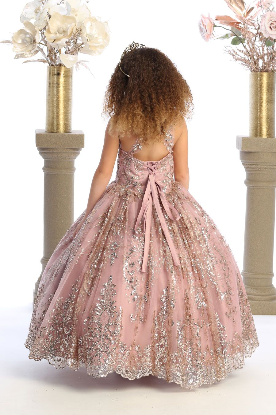 Sparkling and beautiful ballgown for girls. Available in 3 colors: Lavender, Rose, and Emerald Green. The sequins on all the dresses is gold colors. Centered back zipper closure and a corset over it will ensure the dress will fit properly