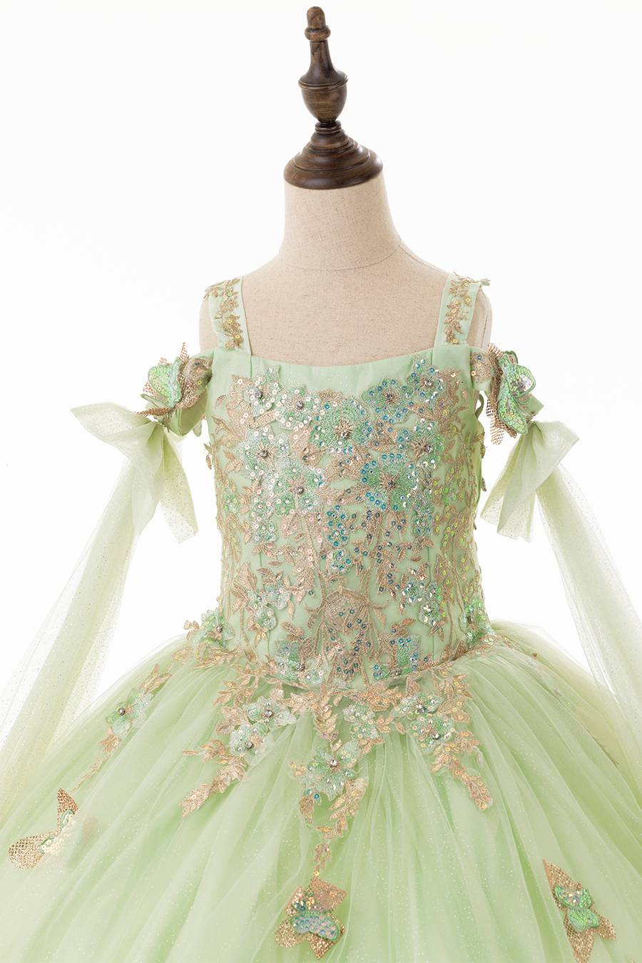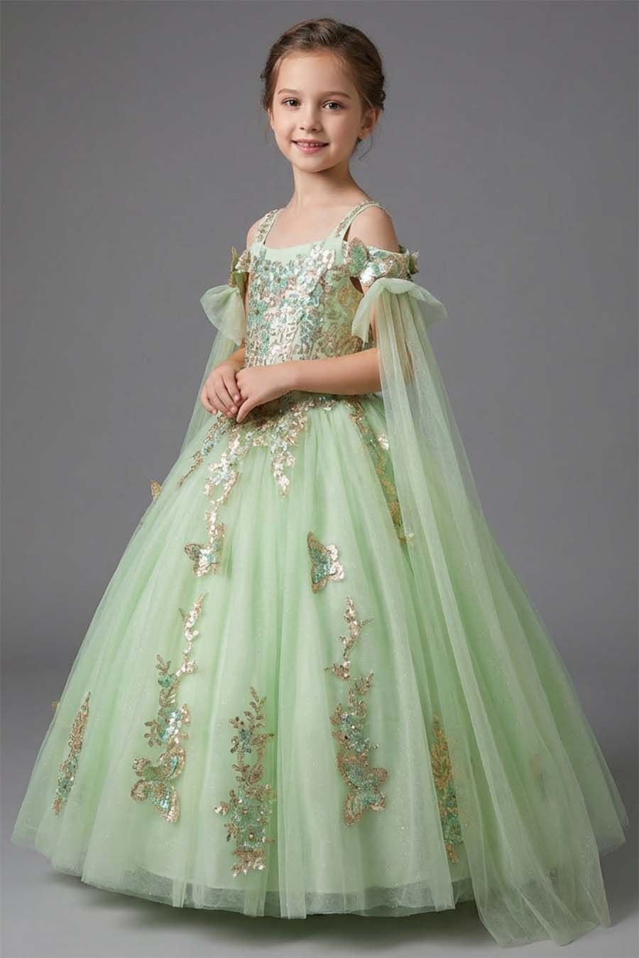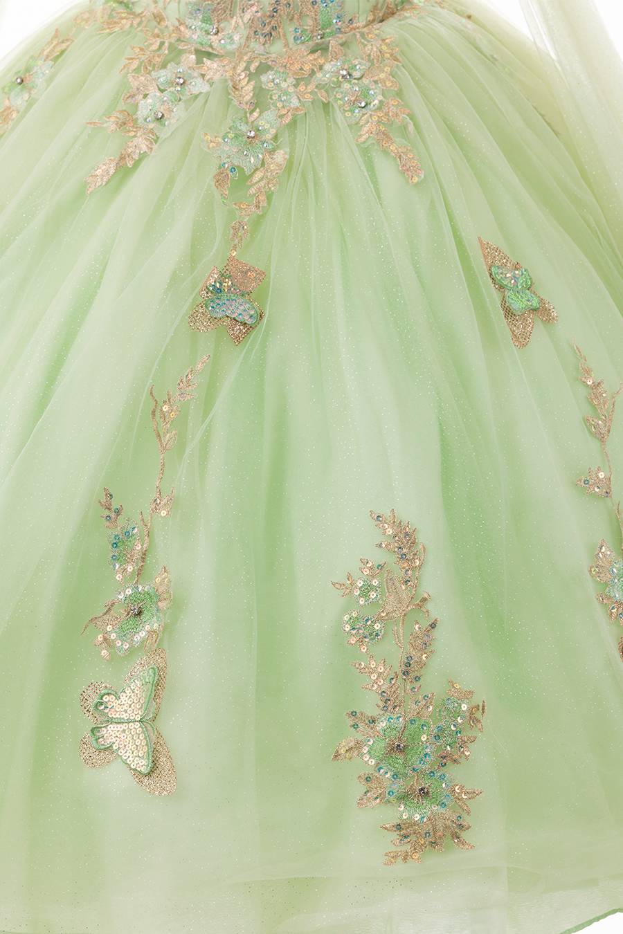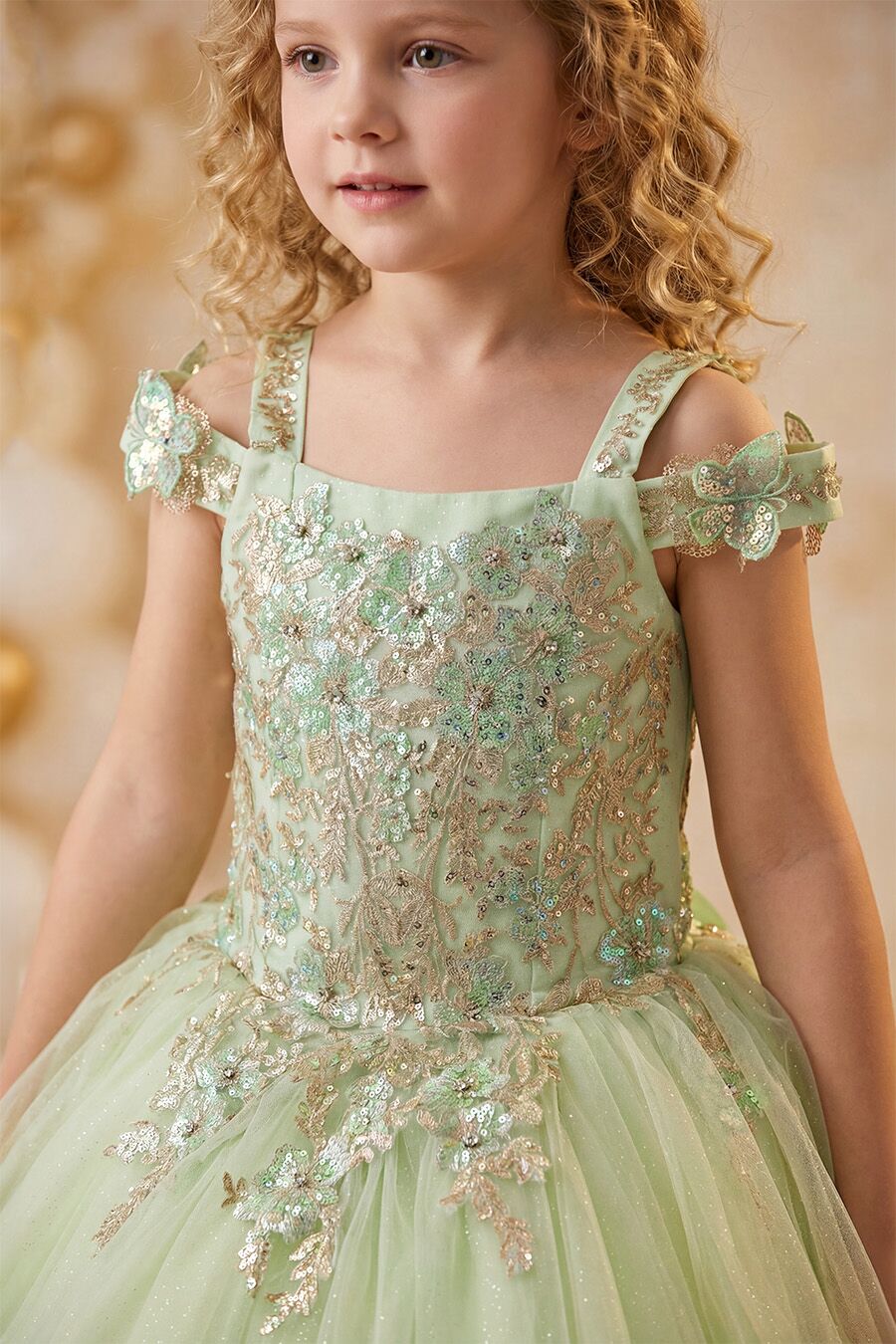 This beautiful sage green dress is perfectly matched with the golden embroidered appliques.