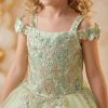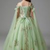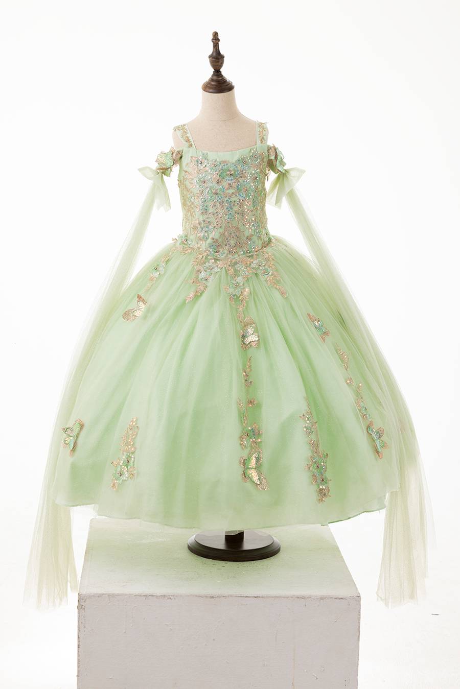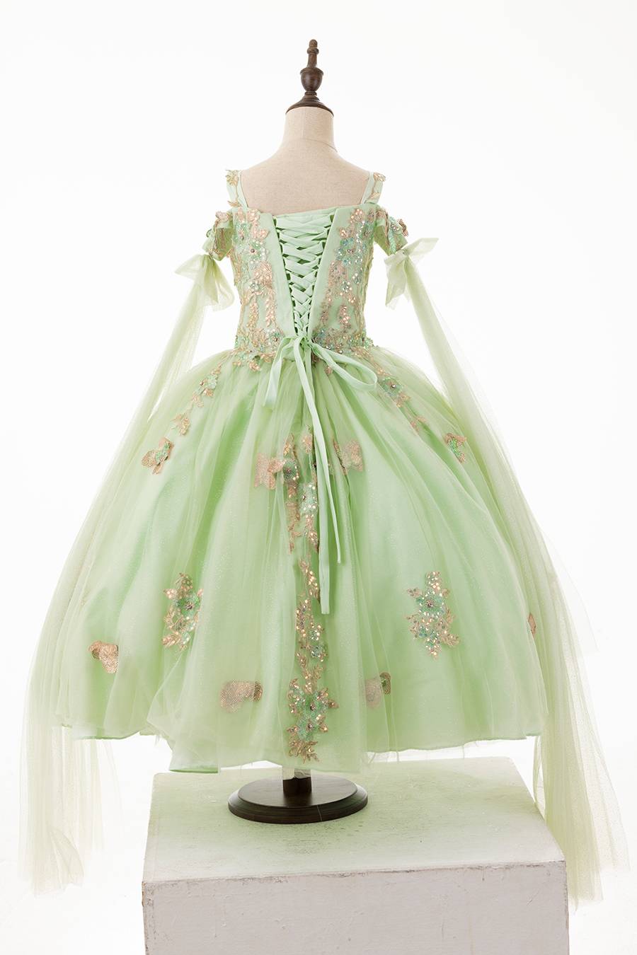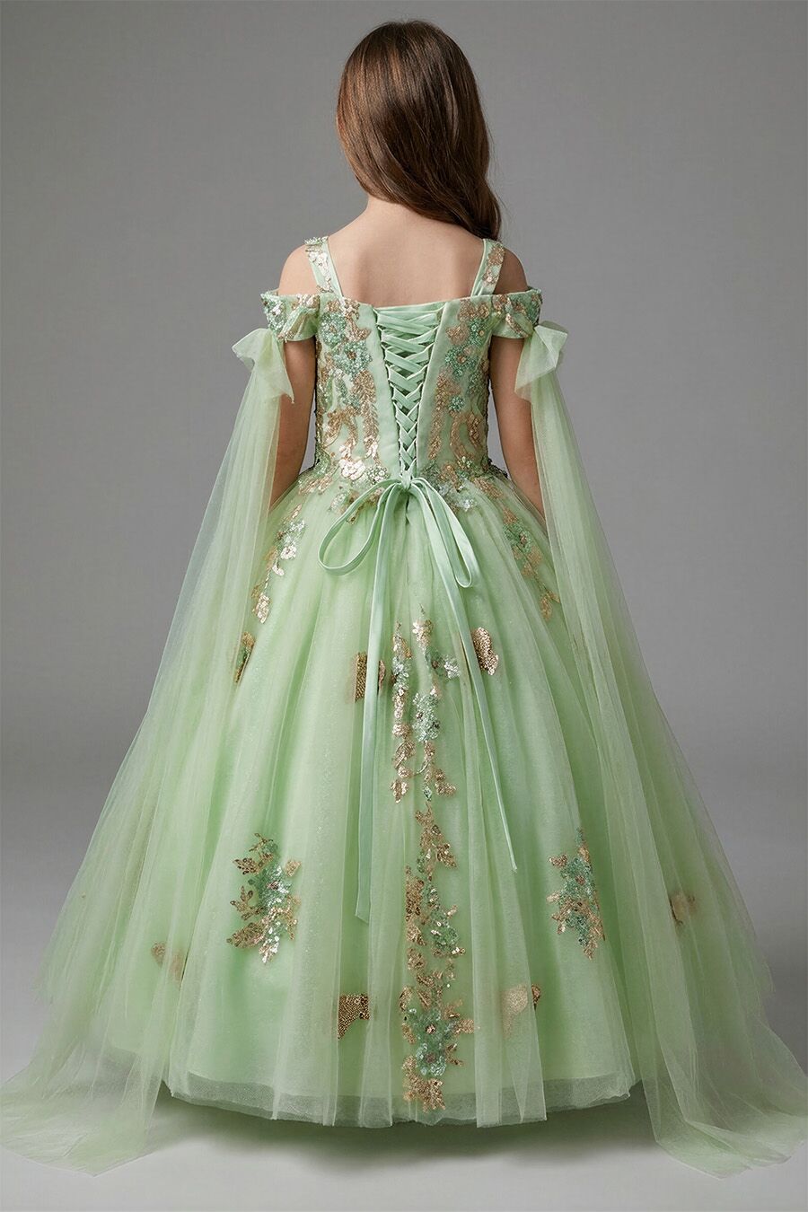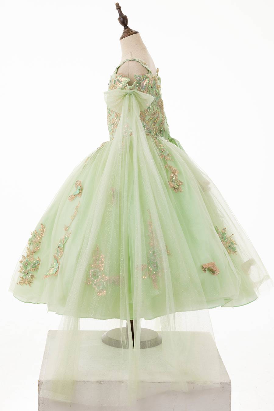 This beautiful sage green dress is perfectly matched with the golden embroidered appliques.