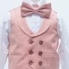 The perfect classic boys suit for all types of occasions. This blush/dusty pink suit for boy’s is a perfect everyday suit. The lapeled waistcoat adds a level of elegance that can be work with out the coat. The double buttons in the vest are reminiscent of a more classic era where looking good and dressing up was a norm. The suit is made with a very soft and silky feeling fabric, thanks to the higher amount of viscose. This suit is made to be enjoyed by the wearer, The extra soft fabric soothes any kid that doesn’t like to wear suit because it’s so comfortable to wear. Other colors available: SAGE GREEN, BABY BLUE, 5 Piece set includes: Compositions: Coat, Vest, and Pants