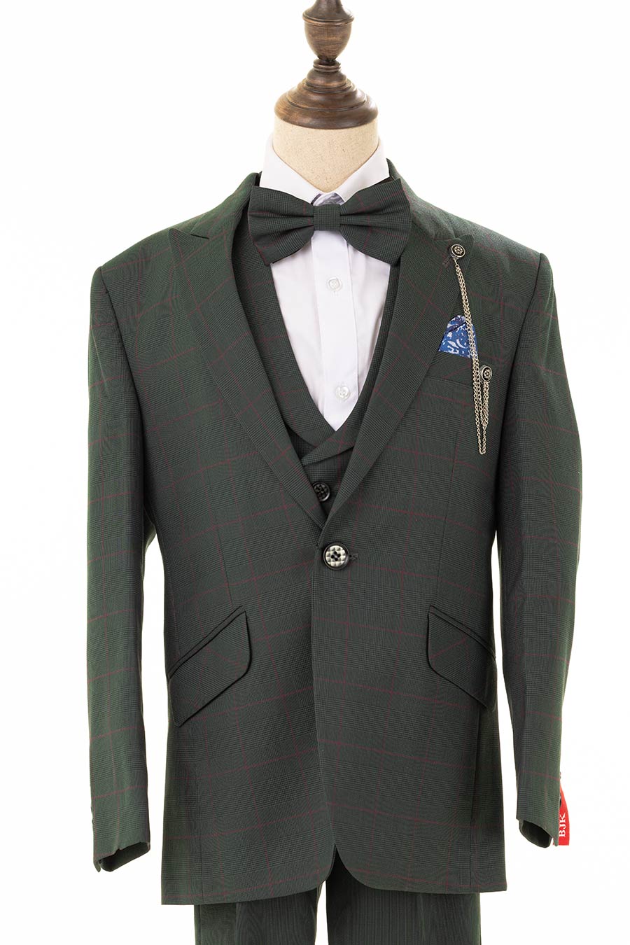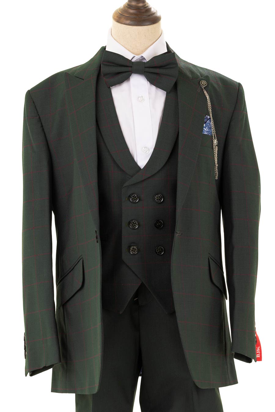 Designer suit for boy’s in a plaid military green color is perfect for a more fashion forward boy. Perfect for special occasions such as birthdays, weddings, school dances, and many more events. Four piece set comes with a coat and vest, pants, and bow-tie.