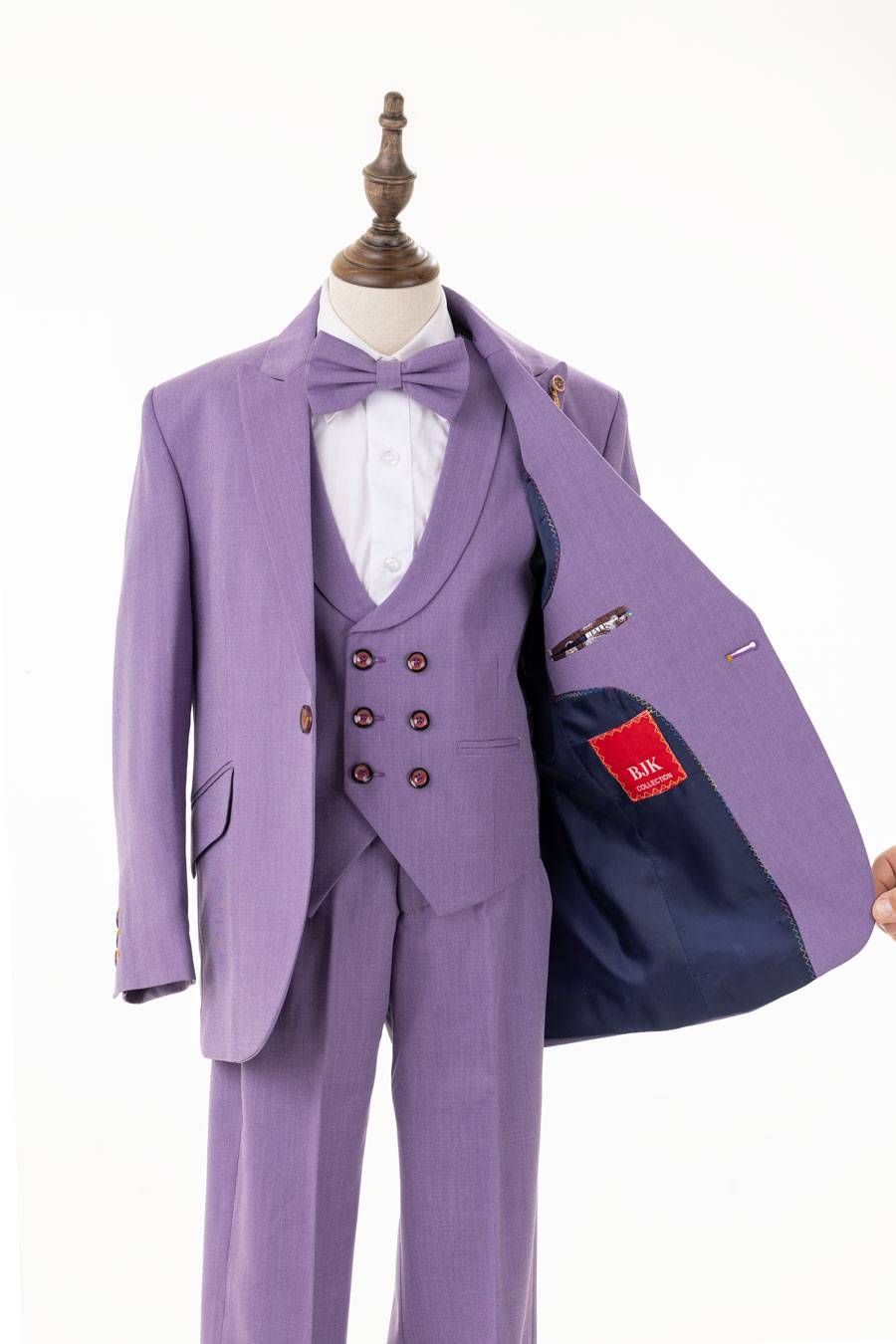 Designer suit for boy’s in a beautiful lavender color is perfect for a more fashion forward boy. Perfect for special occasions such as birthdays, weddings, school dances, and many more events. Four piece set comes with a coat and vest, pants, and bow-tie.