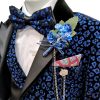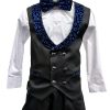 Boy’s Royal blue leopard glitter suit, the attention getter that will make any boy the center of attention. The shine from the glitter is perfectly contrasted by the black velvet jacket. 5 piece set; Jacket, Pants, Vest, Long Sleeve shirt, and Bow tie.