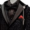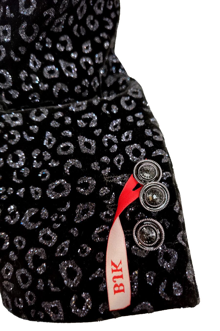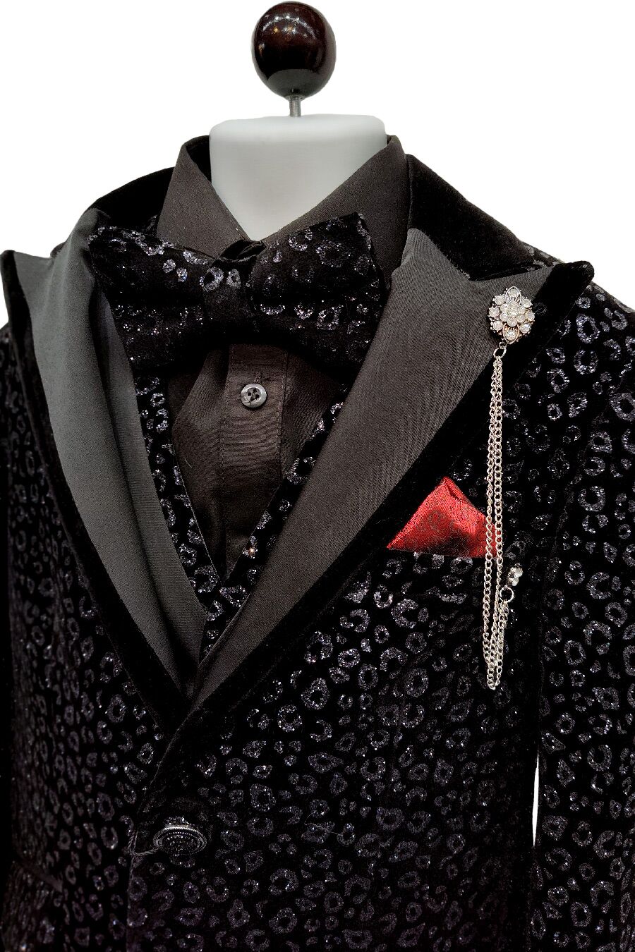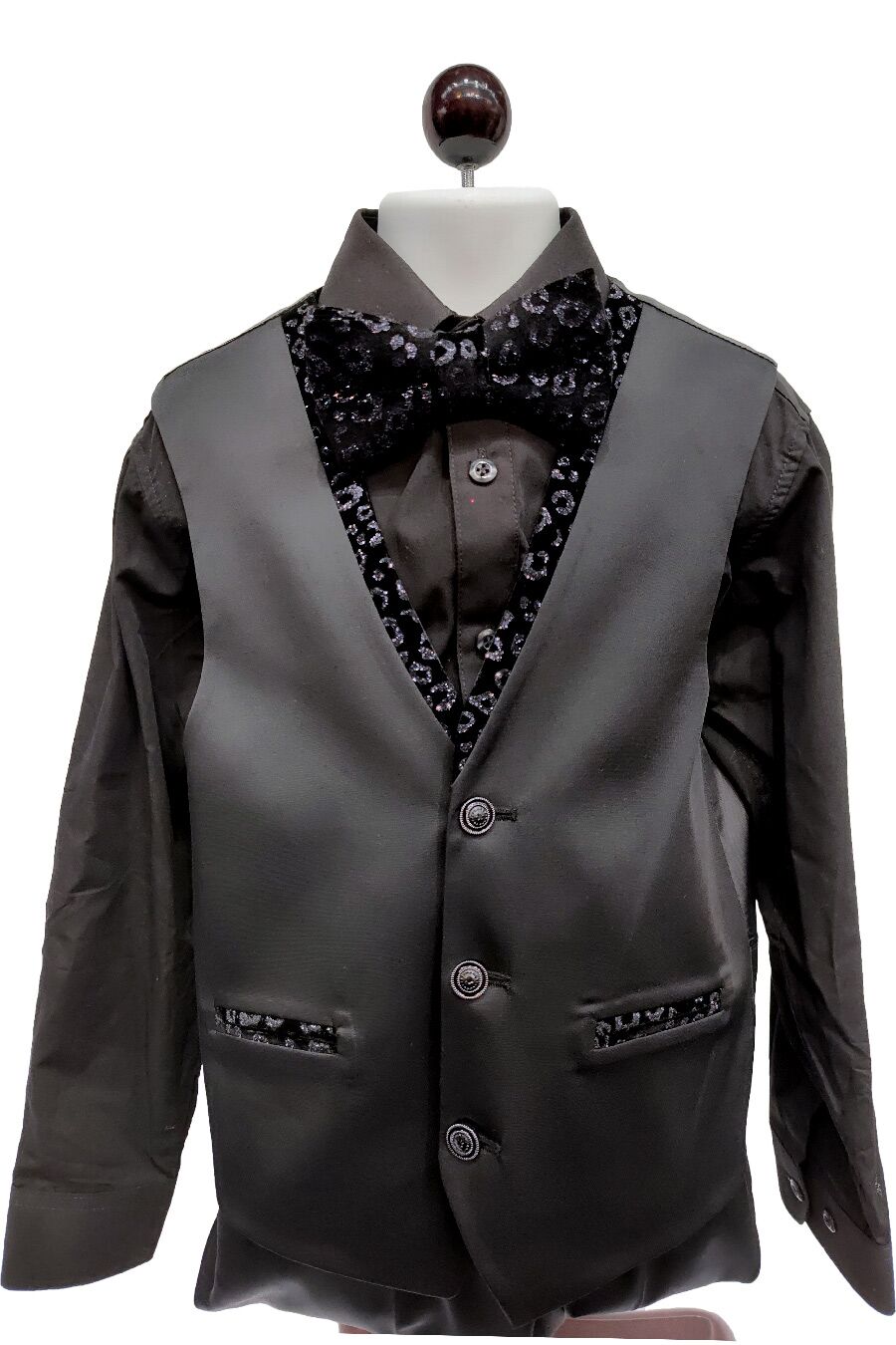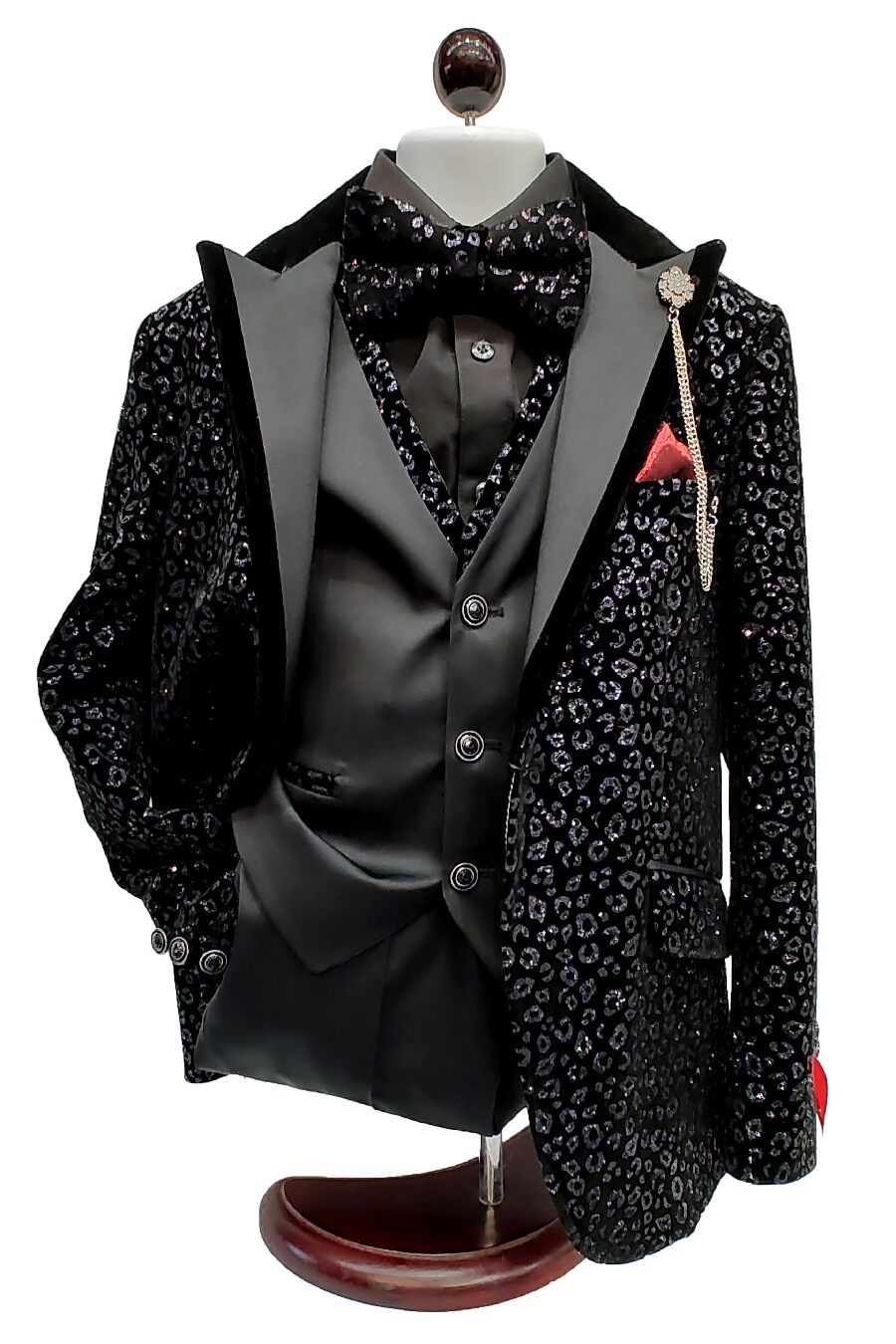 Boy’s black leopard glitter suit, the attention getter that will make any boy the center of attention. The shine from the glitter is perfectly contrasted by the black velvet jacket. 5 piece set; Jacket, Pants, Vest, Long Sleeve shirt, and Bow tie.