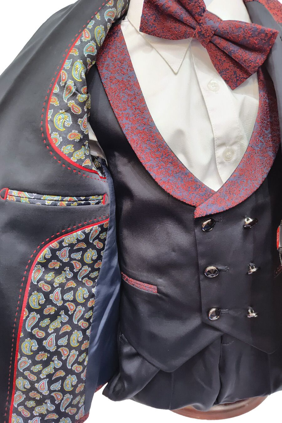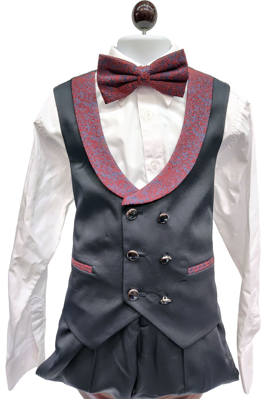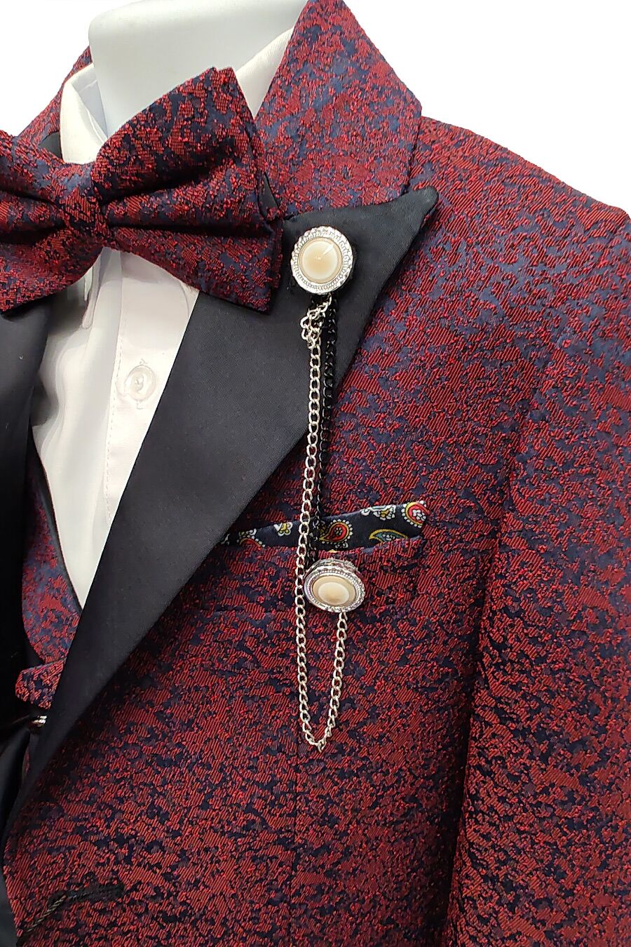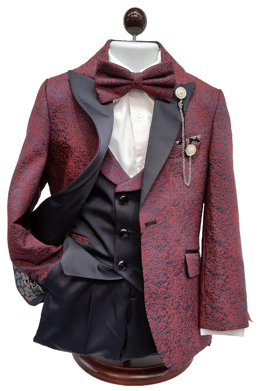 Boy’s Burgundy and Navy blue tuxedo suit, the attention getter that will make any boy the center of attention. The burgundy color is perfectly contrasted by the navy blue background in the jacket. 5 piece set; Jacket, Pants, Vest, Long Sleeve shirt, and Bow tie.