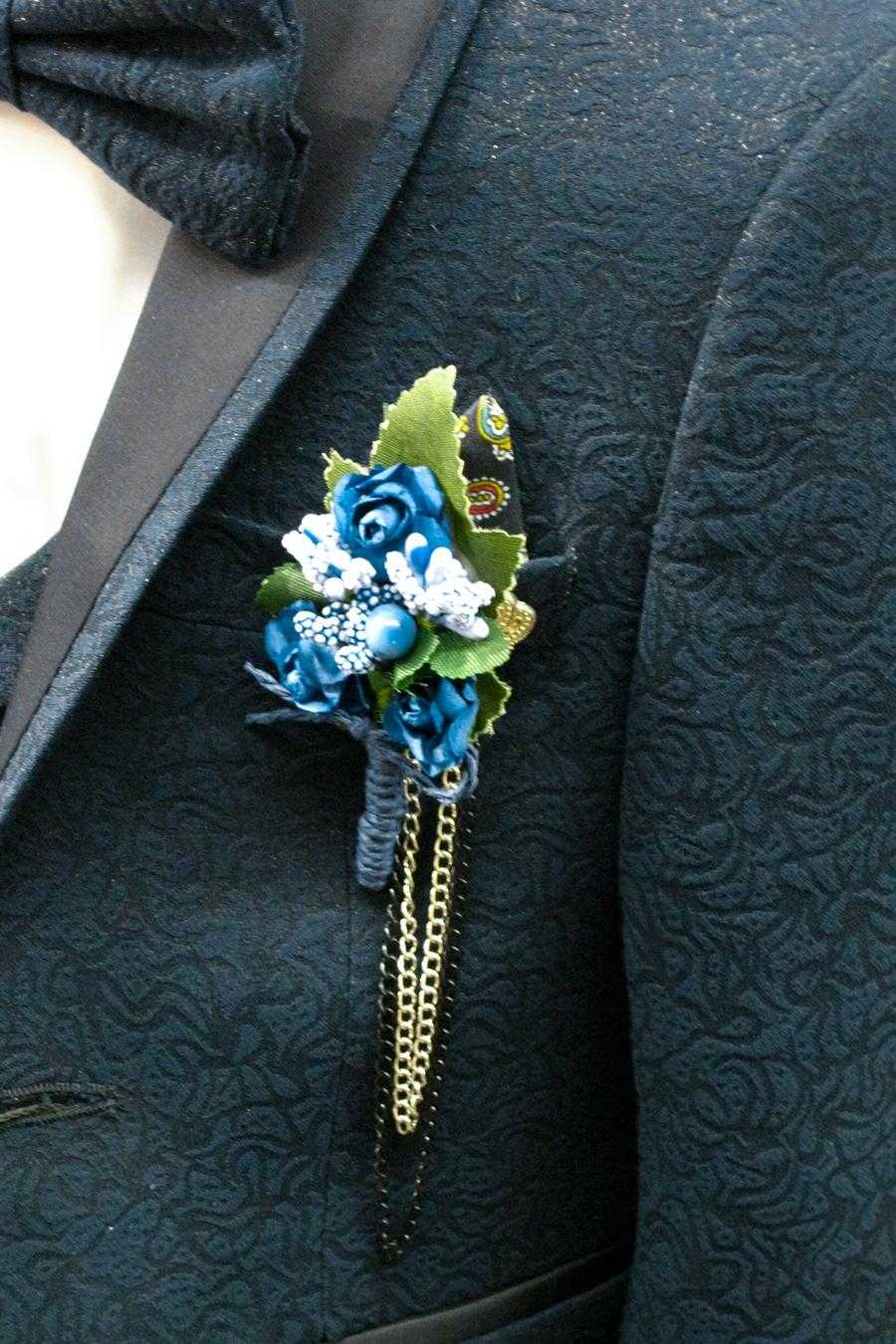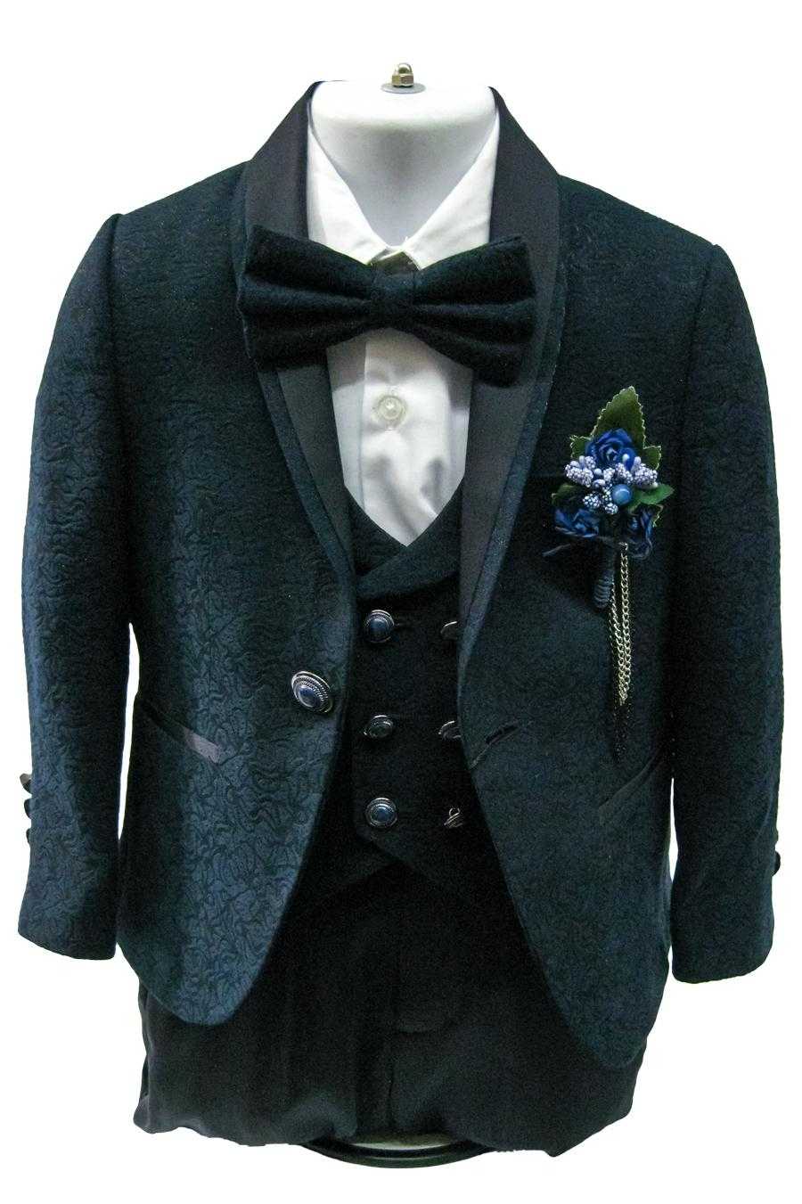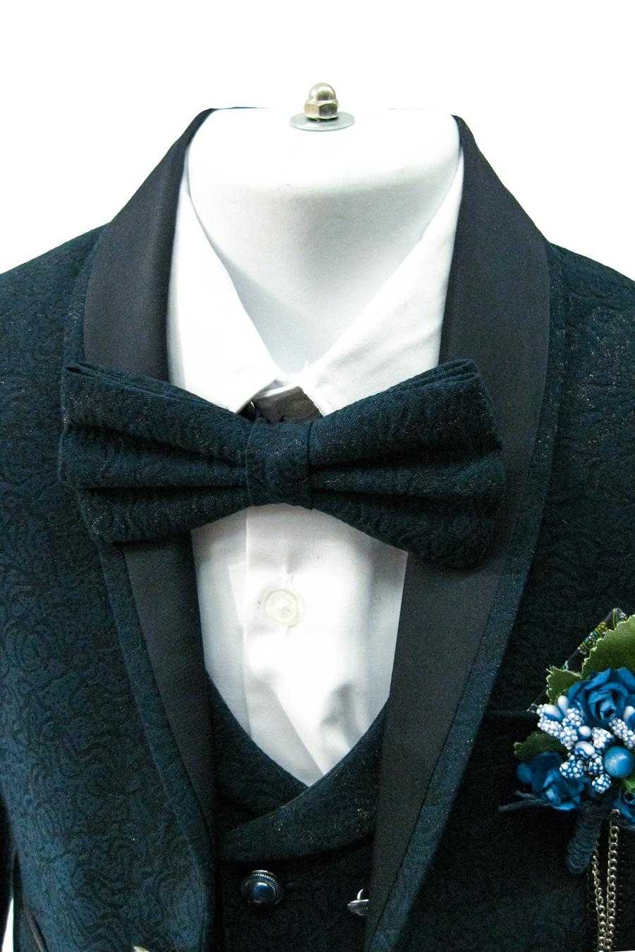 This elegant and stylish tuxedo is made from a jacquard fabric that combines to dark tones, a subtle teal over a dark navy blue.