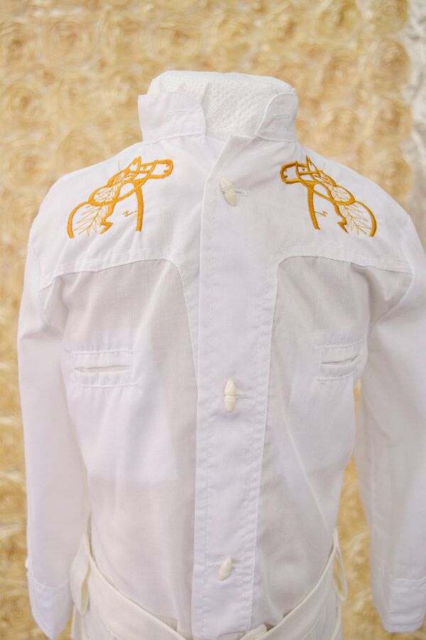 offered at a discount price, Made with Ivory fabric instead of white. White shirt with gold embroidery, Sold as is, no exchanges or returns