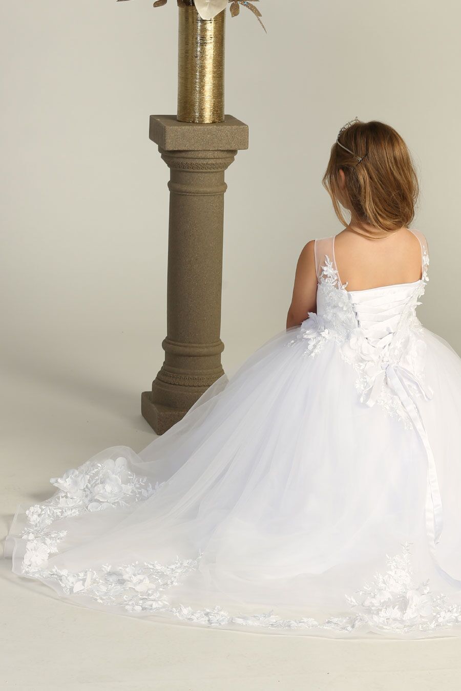 This elegant girls white communion dress is a timeless top seller, designed to make any special occasion unforgettable. Featuring a beautifully detailed bodice with 3D floral lace appliqués, this dress offers a classic yet luxurious look that is perfect for First Communion, formal ceremonies, and special events.
