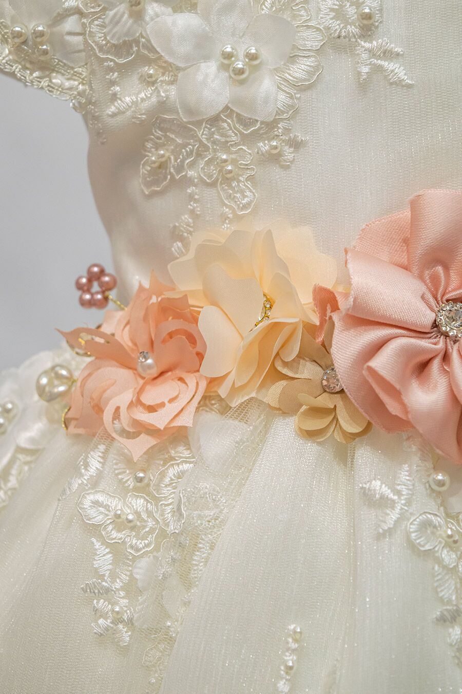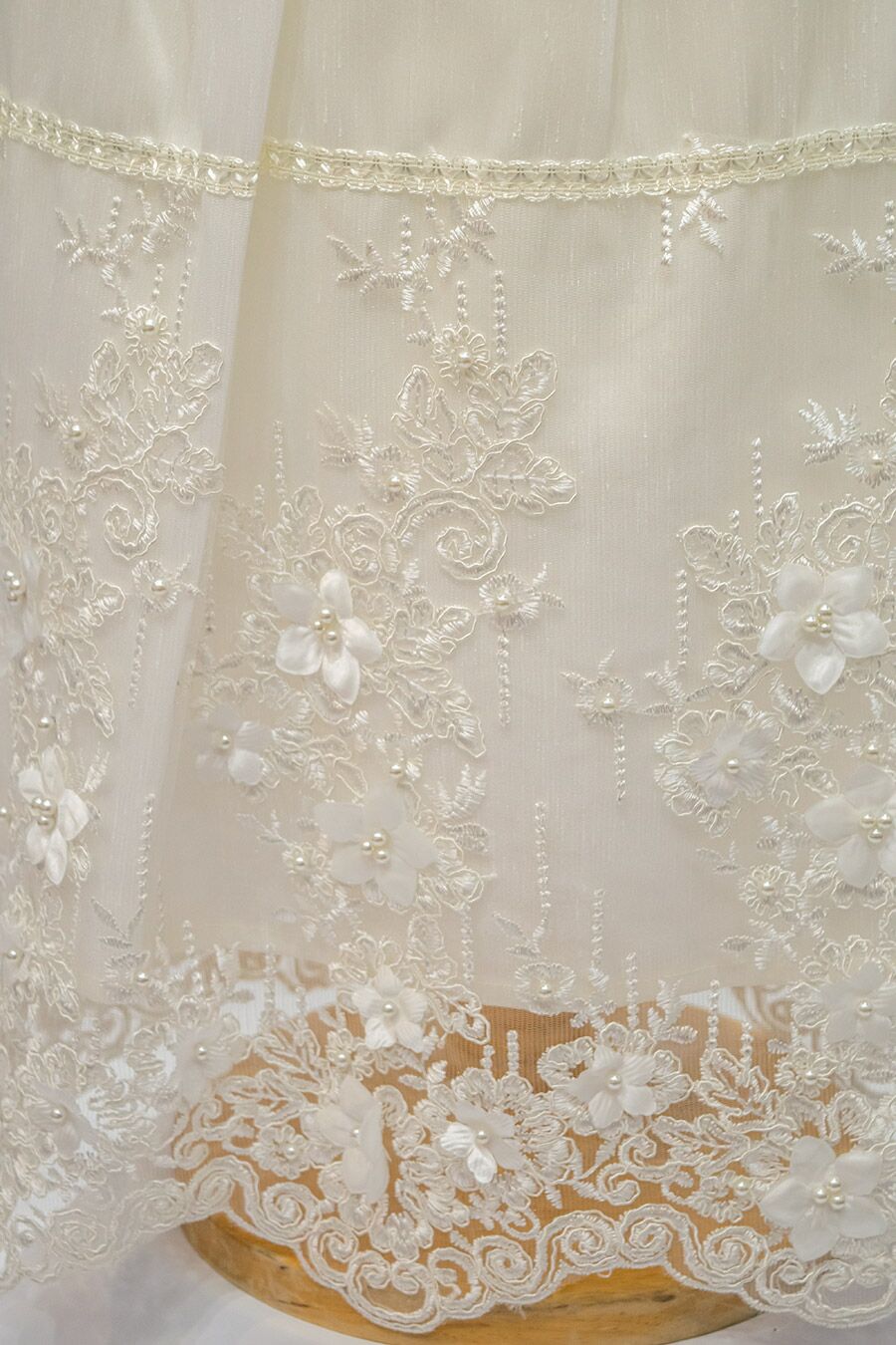 A beautiful girls baptism gown made from a shantung type fabric, made with made hand made appliques and embroidered in a traditional style. The gown in embellished with many ivory pearls that add shine and elegance to the gown.