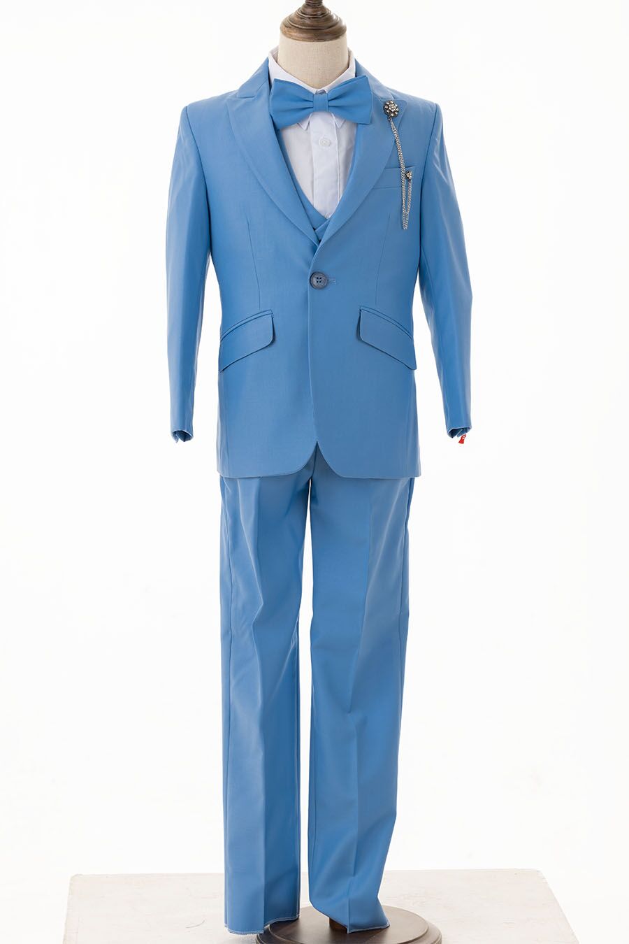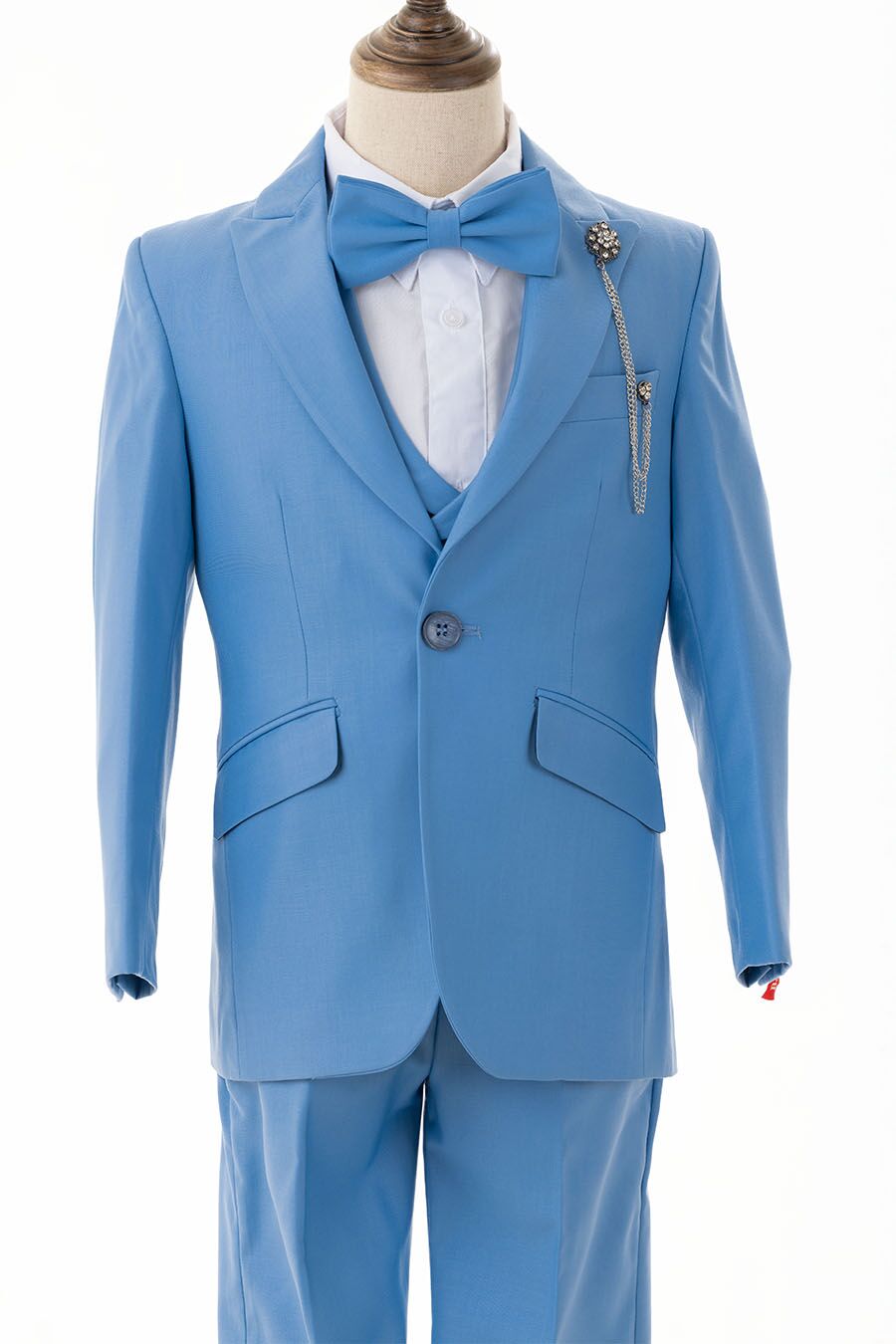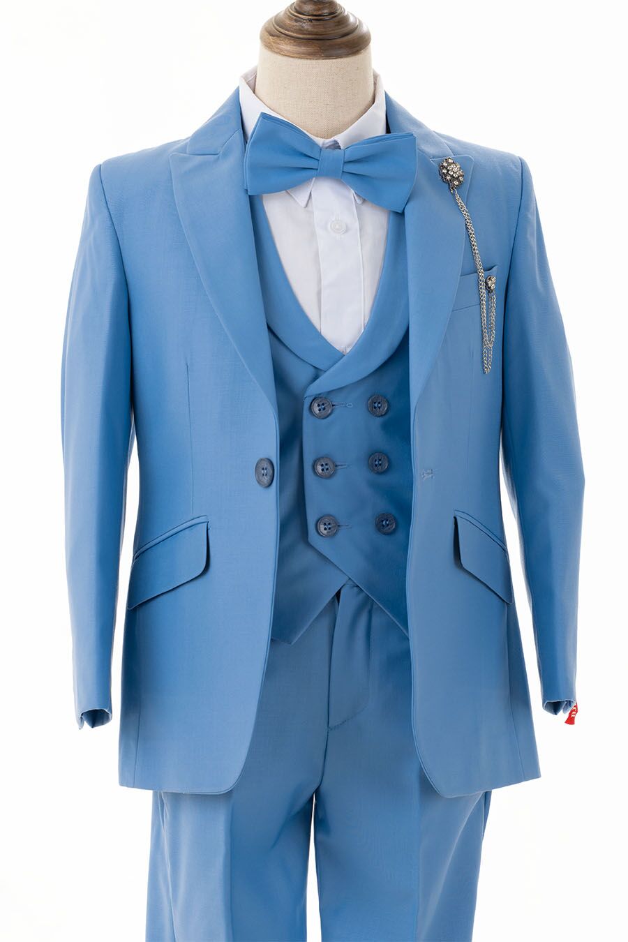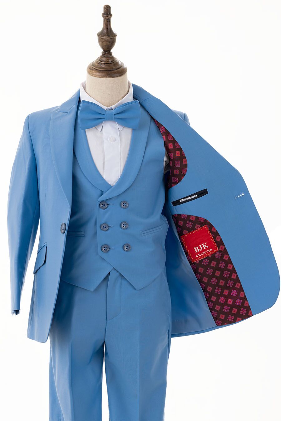 This soft Cerulean suit for boy’s is a perfect everyday suit. The lapeled waistcoat adds a level of elegance that can be work with out the coat. The double buttons in the vest are reminiscent of a more classic era where looking good and dressing up was a norm.