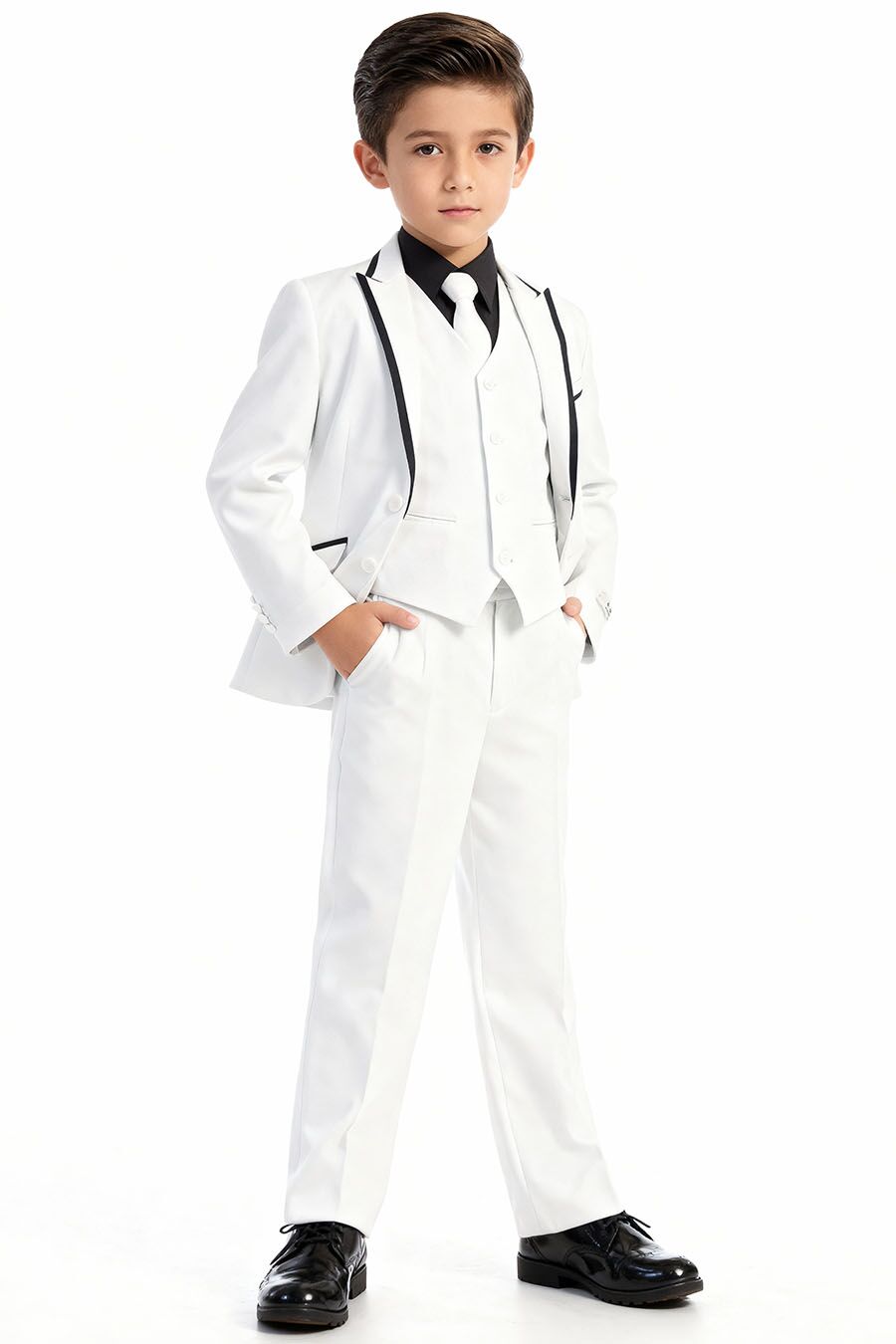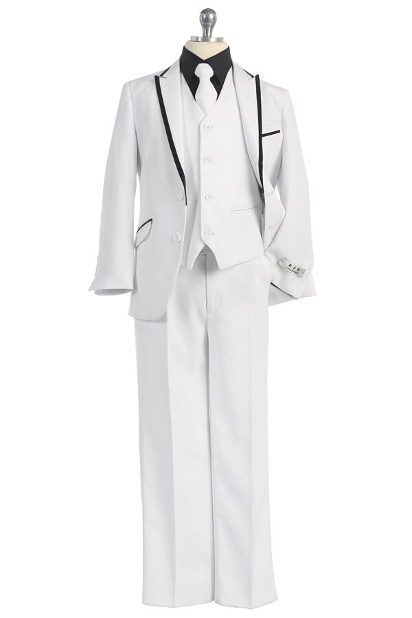 Boy’s white suit with black trims is perfect for Spring-Summer events as well as year round day-time events.