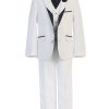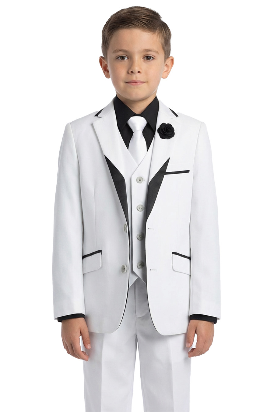 Designer suit for boys in white with black detail in the lapel buttons and trims. This suit comes with white pants as opposed to our other black/white suits which come in white.
